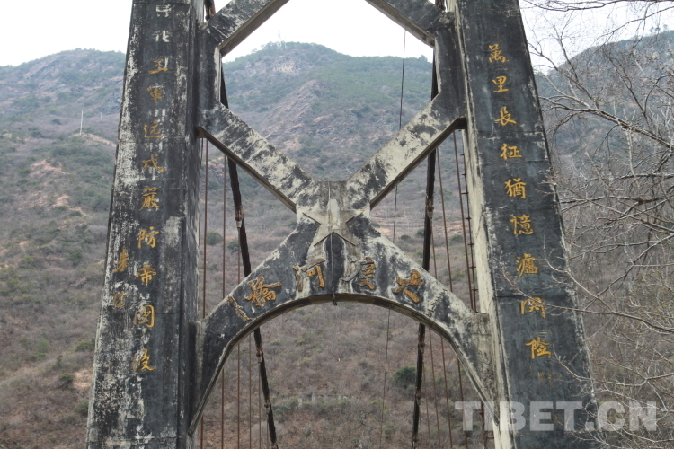 據(jù)了解,大渡河橋東西橋頭塔高分別為16米,孔徑132米,橋面4.5米,由27根直徑約3厘米大小的綱繩分布于左右兩側,中間分別由45根同樣大小的鋼纜吊桿將橋身懸吊在大渡河上,橋身由無數(shù)鋼架鉚焊而成,鋼架之上鋪有約0.5米見方的方橙枕木,上鋪“人”字型拼木,允許載重量15噸。東西橋頭分別建有堅固的崗亭,西橋頭正面豎有三道屏墻,左為原中國人民解放軍第十八軍軍長張國華,政委譚冠三撰寫的碑文,中間書有毛澤東同志七律《長征》詩手跡,右為建橋工程說明。