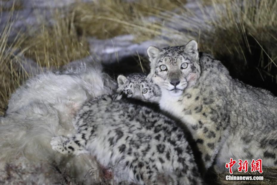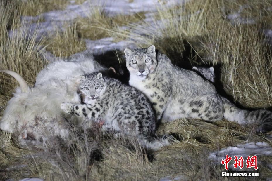 青海天峻3只雪豹“大快朵頤”