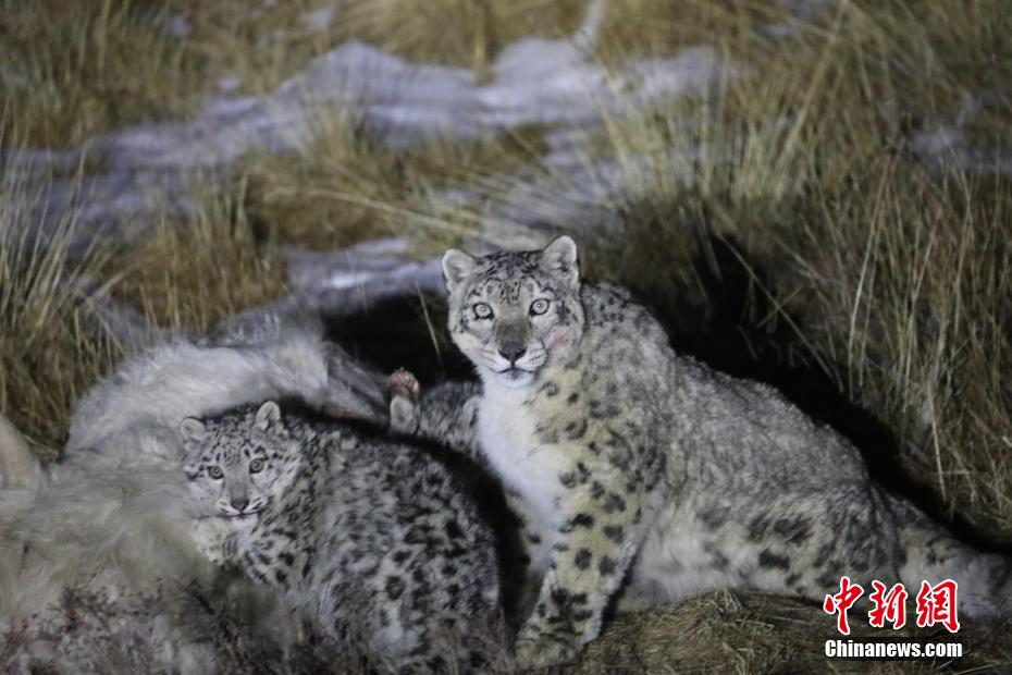 畫面中,3只雪豹正在啃食一只白色牦牛,其中一只雪豹體型較大,大多數時間在“放哨”,其他兩只雪豹體型稍小,但一直在“大快朵頤”,吃飽后“歡快”離開。[詳細] -