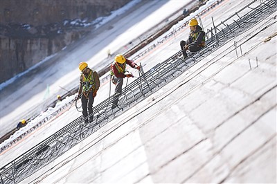 4月1日,瑪爾擋水電站工作人員在壩體上施工。新華社記者 張龍 攝