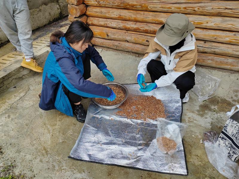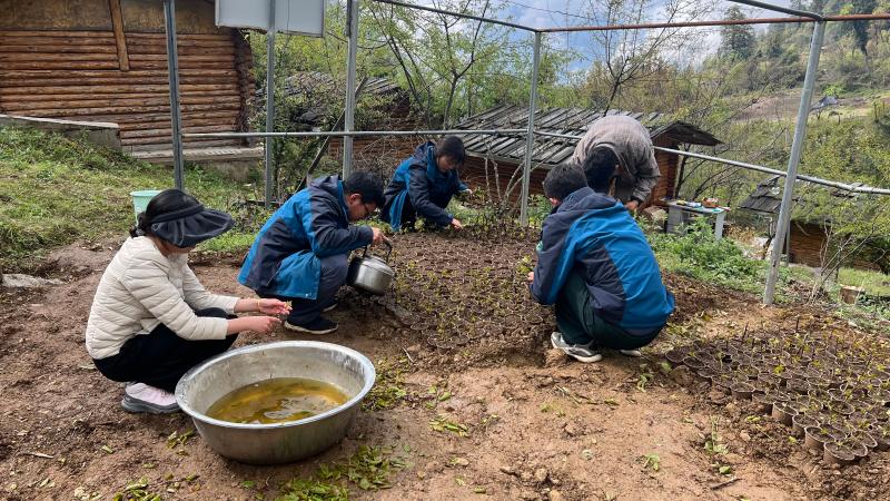 整地、施肥、裝袋、播種……救護(hù)站工作人員、響古箐社區(qū)婦女、駐站研究生分工合作,規(guī)模化培育了雞嗉子(頭狀四照花)、領(lǐng)春木、水青樹(shù)等滇金絲猴主要食源植物幼苗共計(jì)2000余盆。