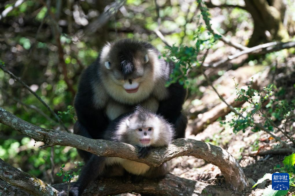 5月23日,在白馬雪山國家級自然保護(hù)區(qū)響古箐片區(qū)內(nèi),一只滇金絲猴在照看幼崽。新華社記者 陳欣波 攝
