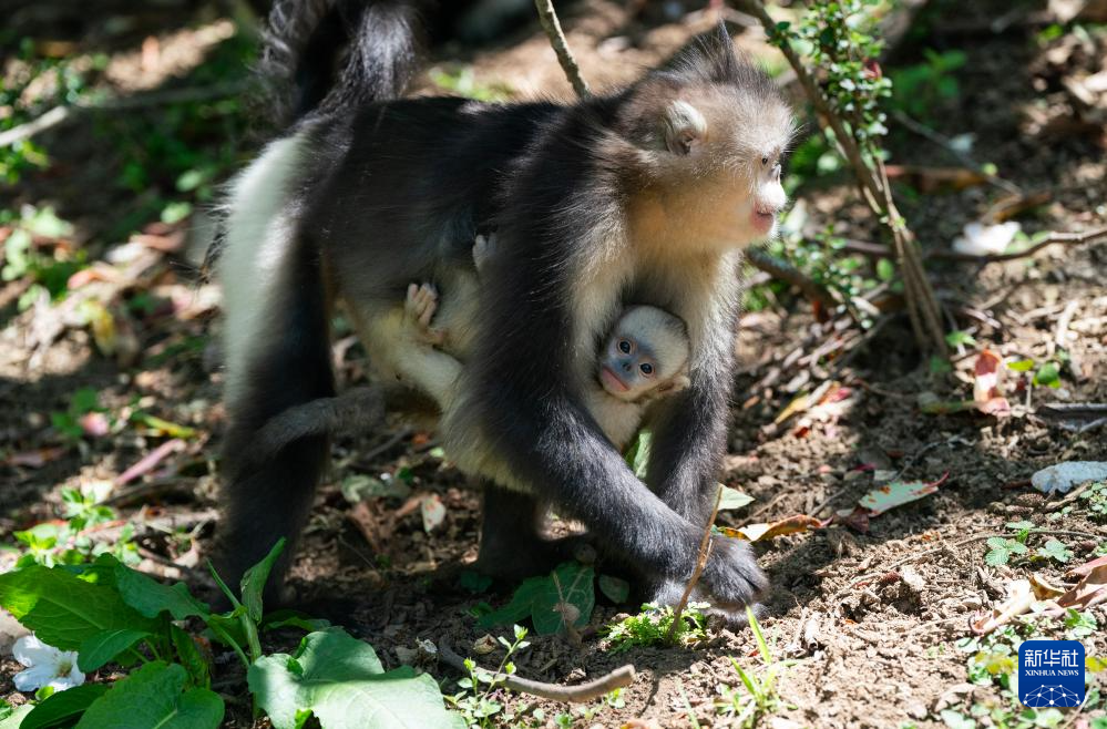 5月23日,在白馬雪山國家級自然保護(hù)區(qū)響古箐片區(qū)內(nèi),一只滇金絲猴帶著幼猴在樹下活動(dòng)。新華社記者 陳欣波 攝