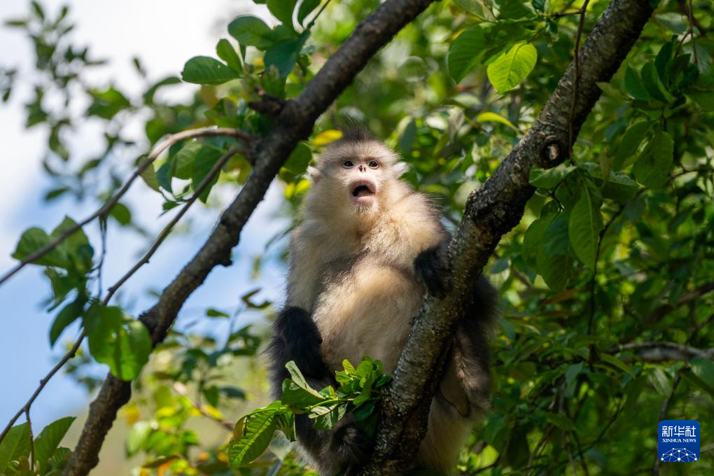 5月23日,在白馬雪山國家級自然保護(hù)區(qū)響古箐片區(qū)內(nèi),一只滇金絲猴在枝頭發(fā)出叫聲。新華社記者 陳欣波 攝