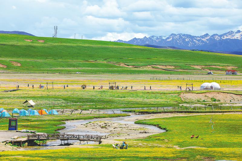 6月24日,記者一行乘車行駛在四川省阿壩藏族羌族自治州九紅草原風(fēng)光路紅原段,窗外掠過一幕幕美景:草原上遍地金黃色小花,小溪蜿蜒流過花叢,遠處群山披著斑駁的“雪衣”。