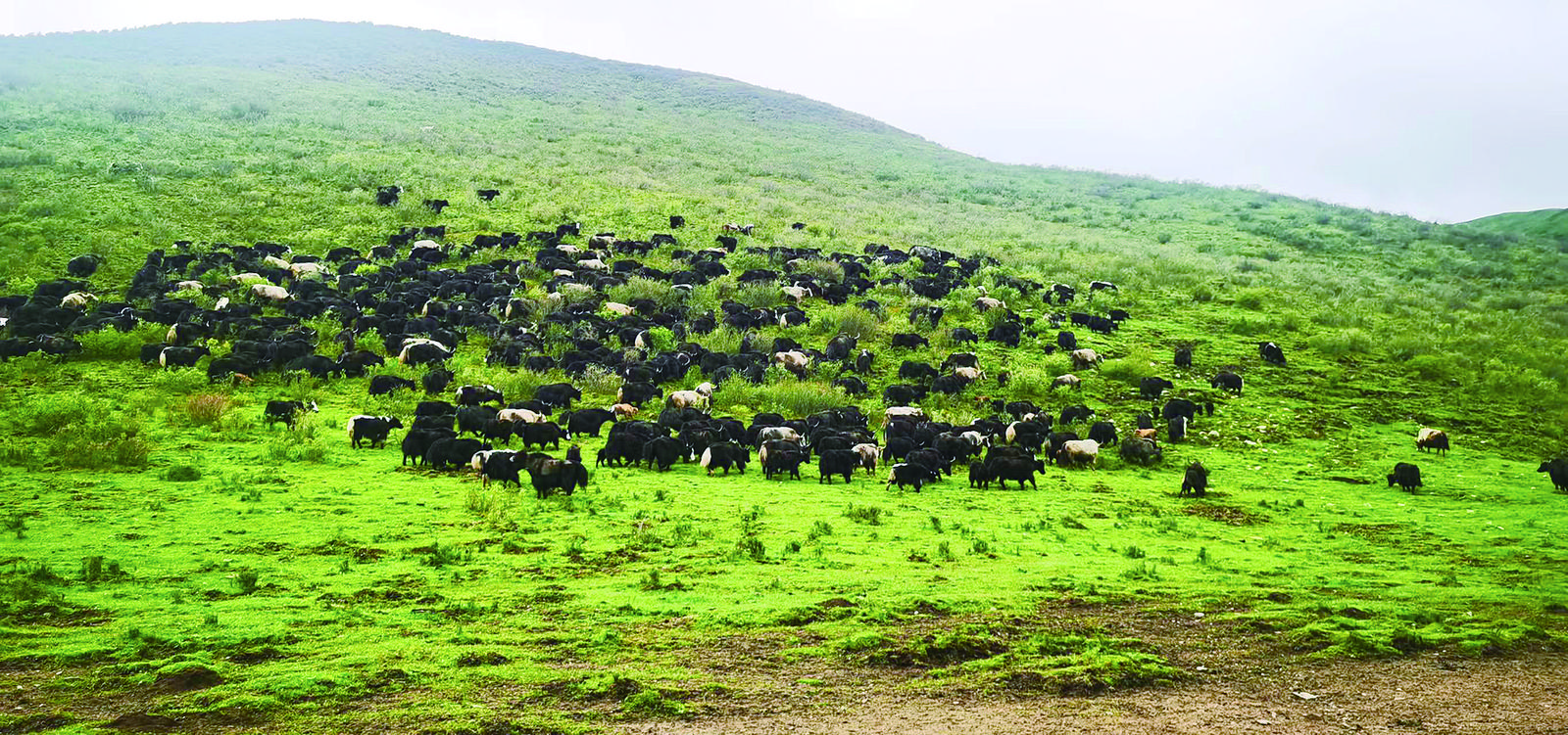 夏日的果洛草原,綠草如茵、野花遍地。瓦藍(lán)的天空下、廣袤的沃土上,牛羊猶如珍珠般散落在草場(chǎng),悠閑自在。