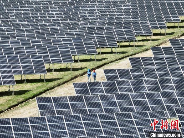圖為國(guó)網(wǎng)青海電力工作人員正在例行巡檢4.4兆瓦村級(jí)光伏電站。馬清 攝
