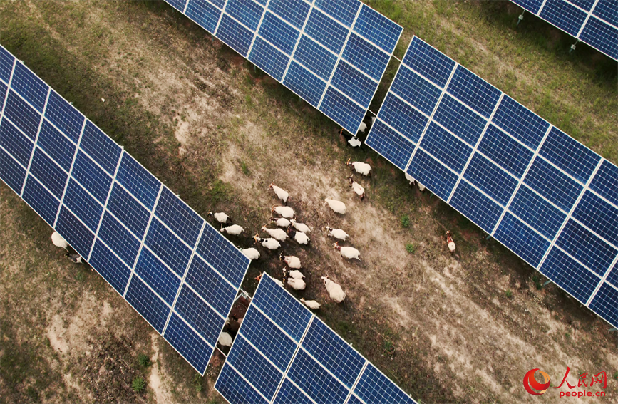 光伏板下正在悠閑吃草的羊群。人民網 馬可欣 攝
