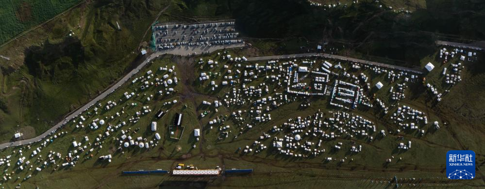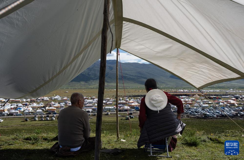 在四川省理塘縣多旺塘,當地群眾在草原上支起天幕和帳篷(7月31日攝)。新華社記者 江宏景 攝