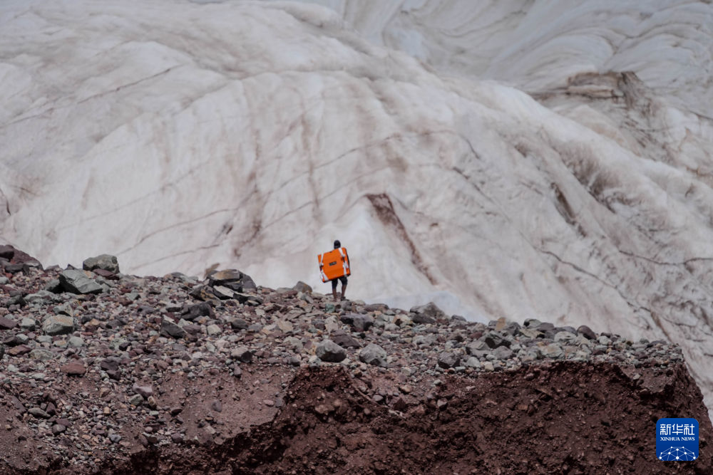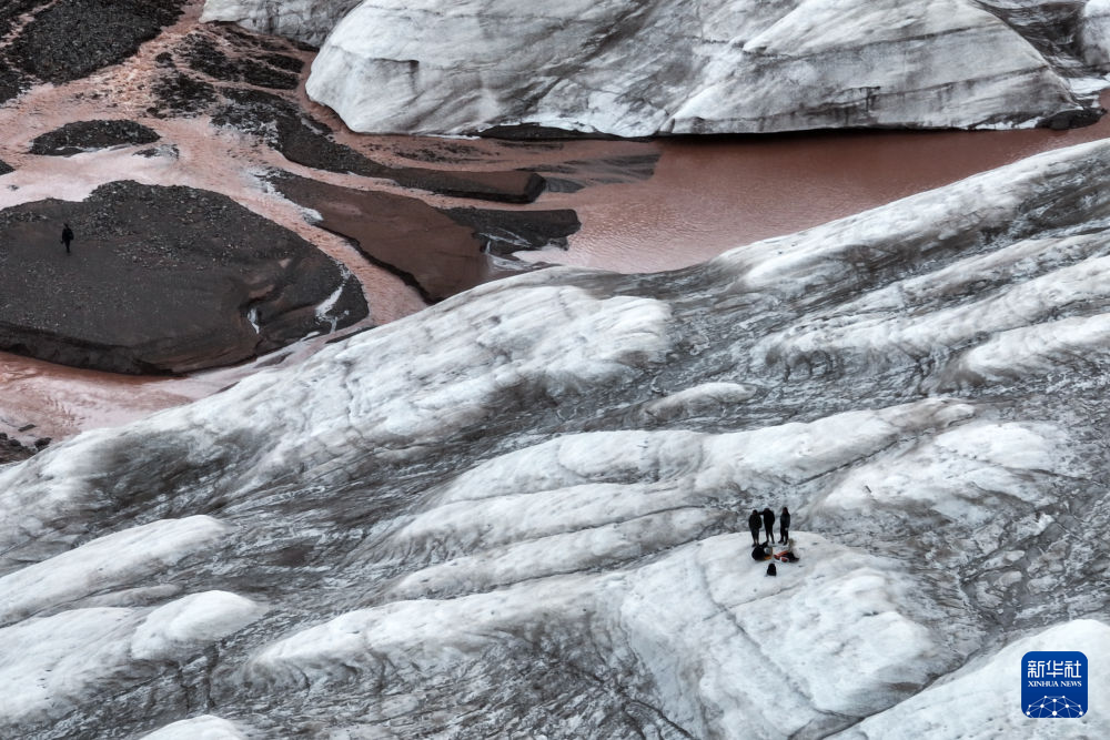 7月25日,在冬克瑪?shù)妆?,科考?duì)員在探測(cè)冰川(無(wú)人機(jī)照片)。新華社記者 伍志尊 攝