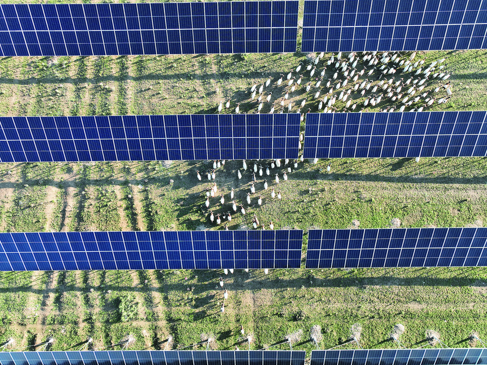 在這片藍綠交織之間,一群群“明星”或是悠閑踱步,或是低頭覓食,大伙兒為它們起了一個識別度很高的名字——“光伏羊”。