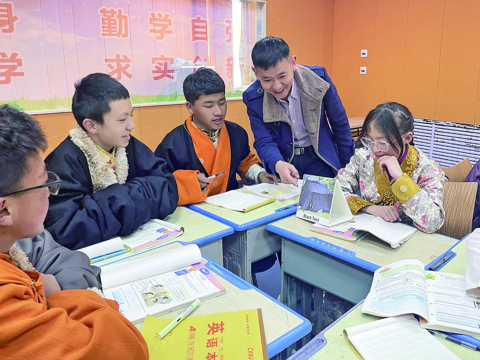 上海第五批援青團隊成員,果洛州民族高級中學(xué)英語工作室主持人、高三教師芮學(xué)國,為學(xué)生輔導(dǎo)英語課程。上海第五批援青團隊供圖