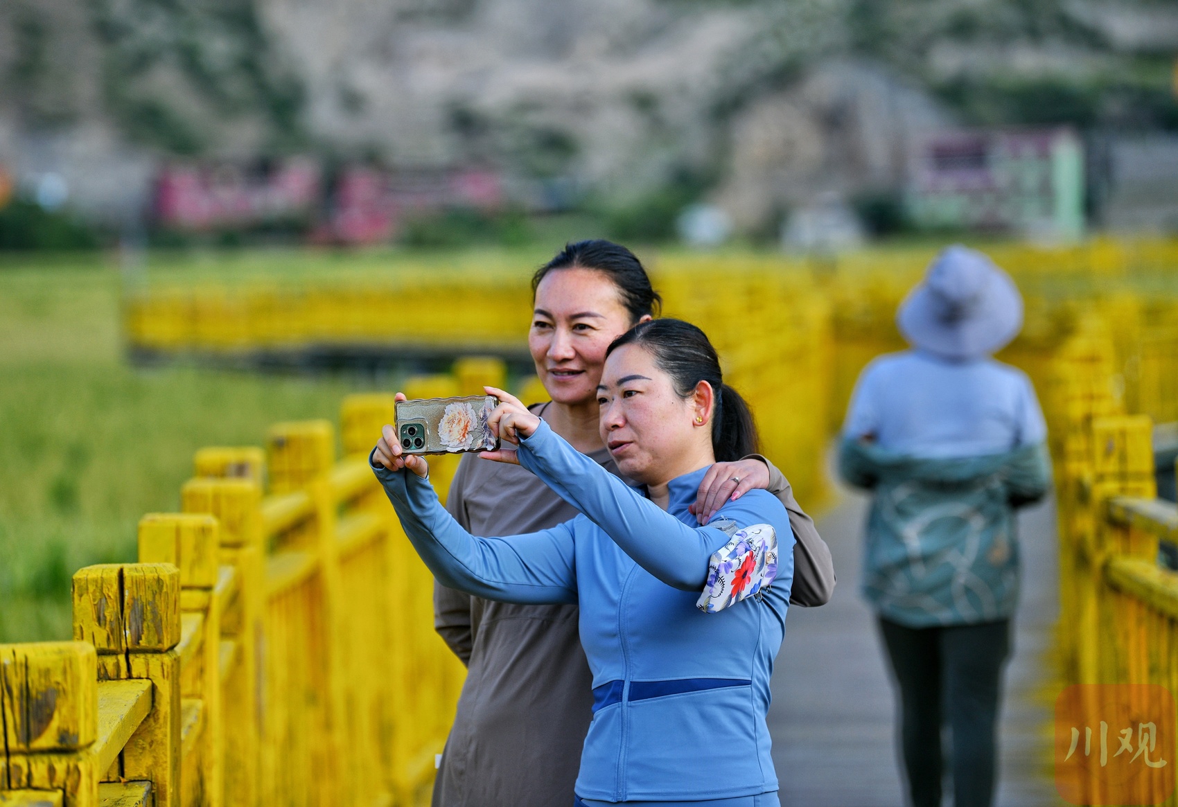 據(jù)了解,“田園棧道”是巴塘縣在農(nóng)旅結(jié)合、觀光農(nóng)業(yè)方面作為亮點(diǎn)打造的特色景點(diǎn),現(xiàn)如今是網(wǎng)紅地,不少自駕游的旅行者都會(huì)慕名前來田園棧道打卡。吸引的不止是游客,當(dāng)?shù)鼐用褚蚕矚g早晚來這里漫步??吹接浾咴谂恼?,棧道上晨練的當(dāng)?shù)厝诵χ?qǐng):“這里漂亮吧,每天都有像您這樣的人拿著相機(jī)來拍照,拍完就走一圈,走棧道一圈只需要2500步?!?/p>