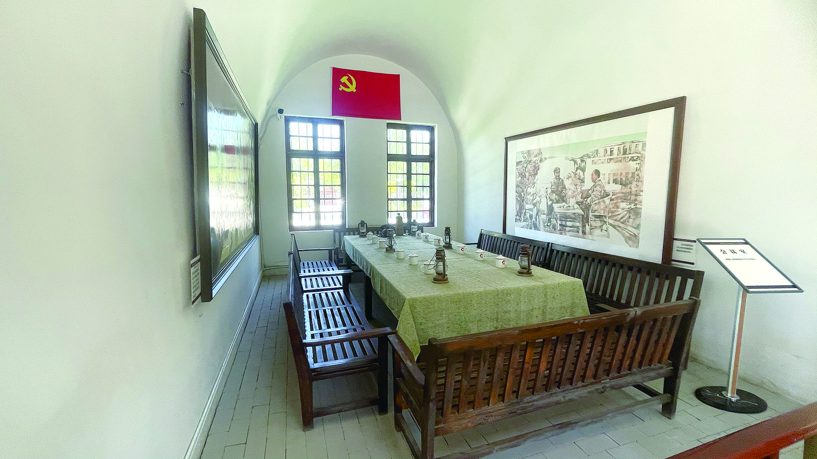 將軍樓的一樓是仿窯洞式建筑,會議室里彌漫著一種莊嚴的氛圍。辦公桌上那簡單的辦公用品,似乎還留有當年的印記,那是他們?yōu)閴粝電^斗的痕跡。
