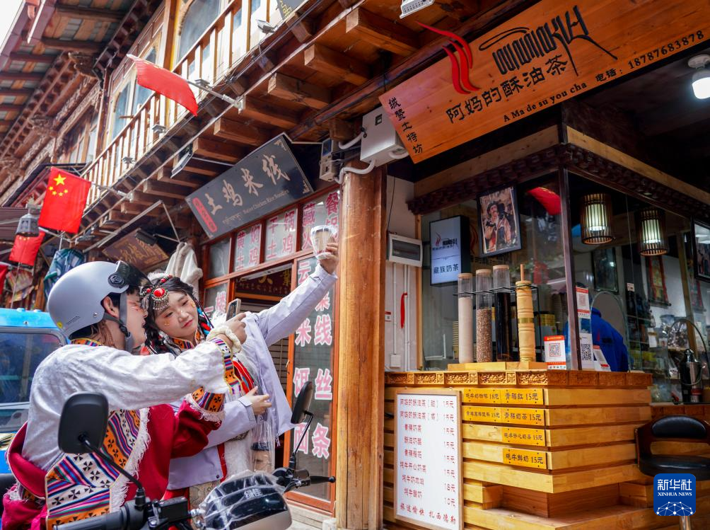 9月27日,游客在獨克宗古城里購買特色美食后拍照打卡。新華社記者 王靜頤 攝