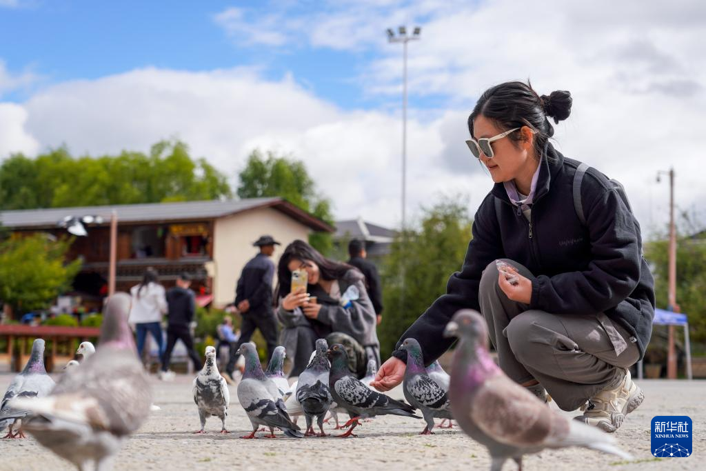 9月27日,游客在獨克宗古城喂鴿子。新華社記者 王靜頤 攝