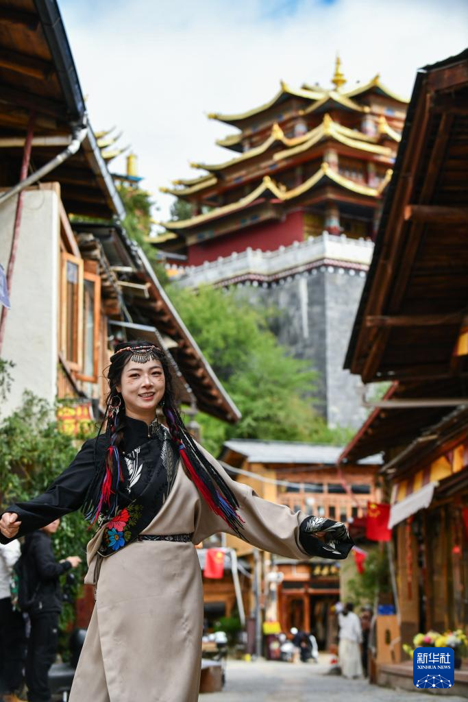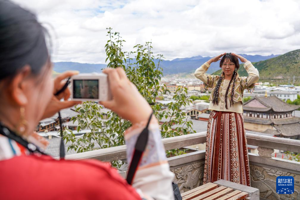 9月27日,游客在獨克宗古城里體驗旅拍。新華社記者 王靜頤 攝
