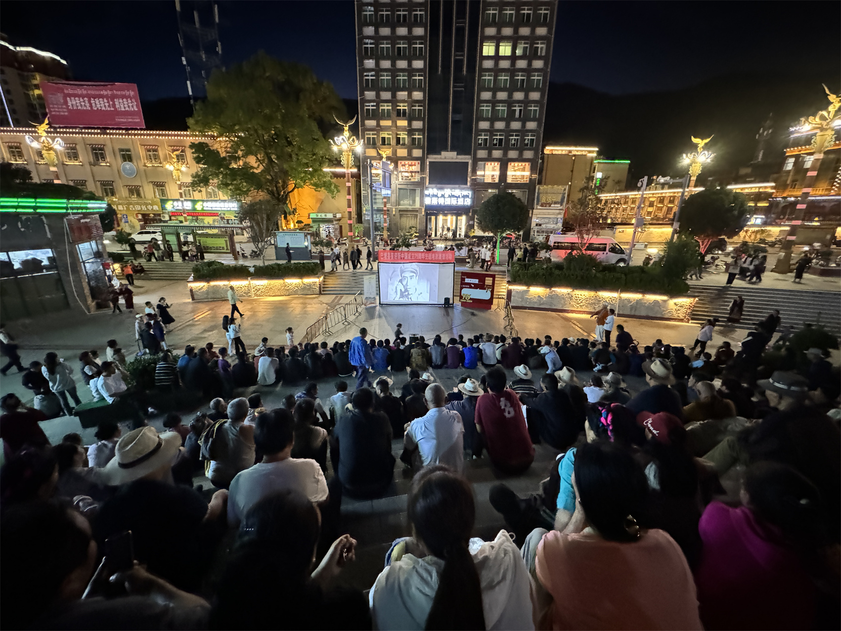 “吃過晚飯就來廣場等著了,好久沒看過壩壩電影,今天帶著小孩來感受一下?!卑吞量h市民翁吉說。夜幕降臨,巴塘縣中山廣場早早地聚集了眾多滿懷期待的市民。一塊巨大的白色幕布在廣場中央拉起,仿佛在訴說著一個(gè)個(gè)精彩的故事。工作人員們忙碌地調(diào)試著設(shè)備,為即將開始的電影放映做著最后的準(zhǔn)備。