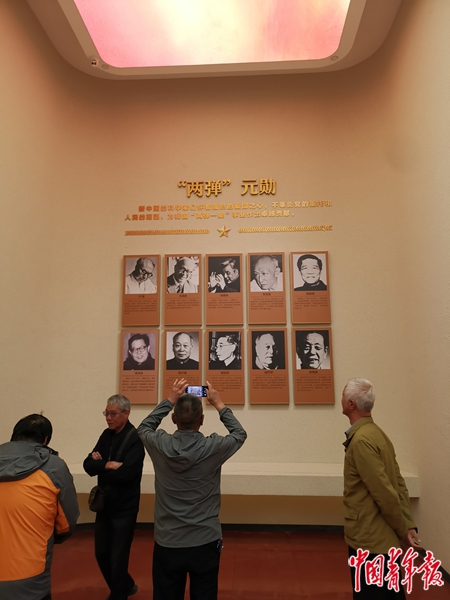 觀眾在青海原子城紀(jì)念館展出的“兩彈一星”元?jiǎng)渍掌芭恼?。張?guó) 攝