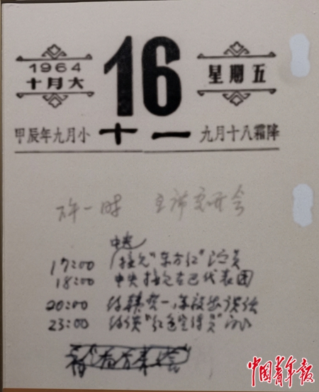 青海原子城紀(jì)念館展出的周恩來(lái)總理1964年10月16日的日程表。他在接見(jiàn)《東方紅》演職人員時(shí)宣布了第一顆原子彈爆炸成功的消息。張國(guó) 攝
