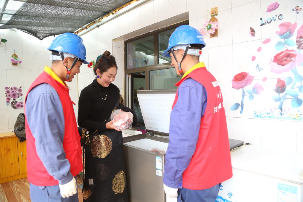 9月29日,通電后蘇里鄉(xiāng)牧民向供電服務(wù)人員展示冰箱冷凍過的肉。許小萍 攝