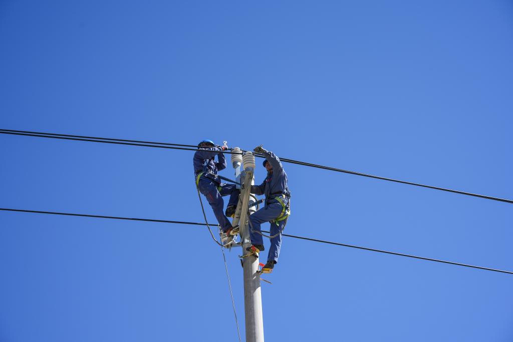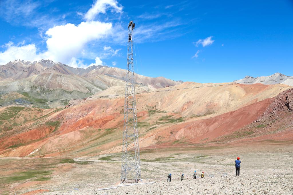 9月6日,國網(wǎng)青海省電力公司輸電專業(yè)施工人員架設(shè)安裝蘇里鄉(xiāng)10千伏線路。徐琛 攝