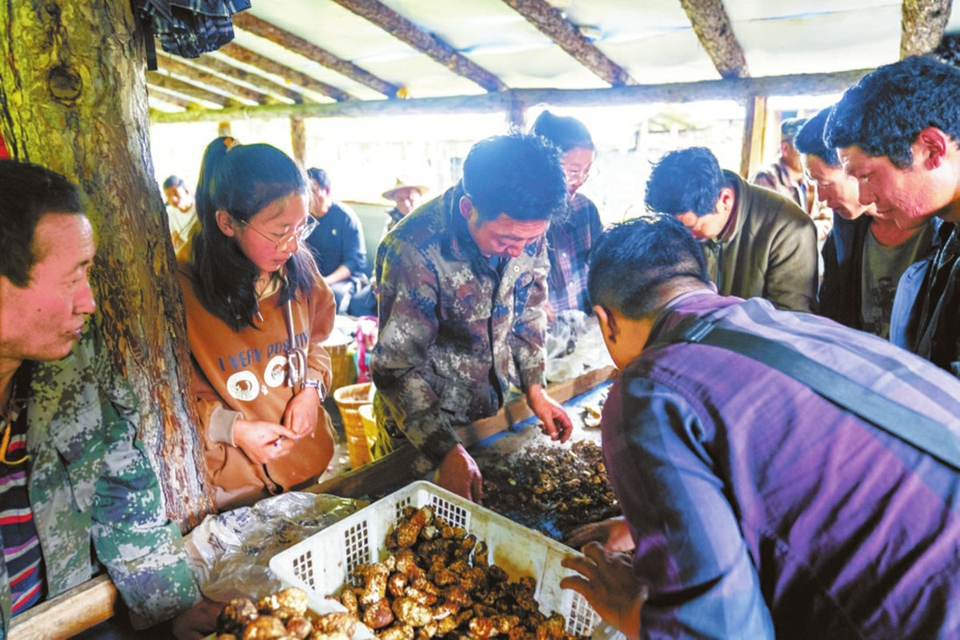 木里縣博窩鄉(xiāng)存則洋松茸山臨時交易市場內(nèi),人們正在交易松茸。
