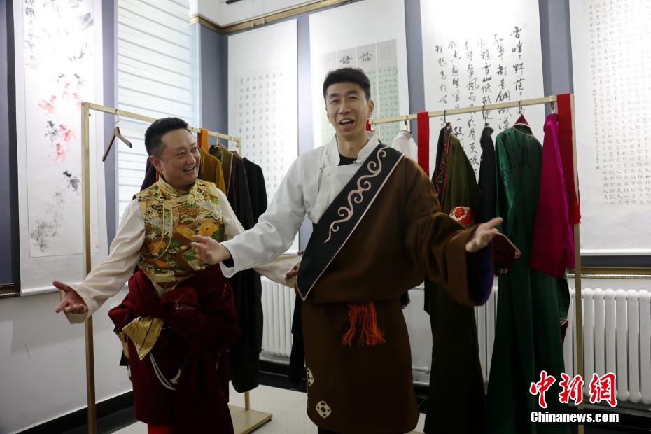 圖為里約奧運會跆拳道冠軍趙帥(右)體驗藏族服飾。中新社記者 張?zhí)砀?攝