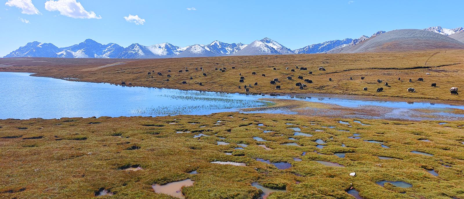 天遠(yuǎn)地闊,我們在草原上行駛了數(shù)小時(shí),眼前的風(fēng)景既相似又千變?nèi)f化。藍(lán)天和河流同樣鮮明澄澈,初秋的短草已經(jīng)開始泛黃,時(shí)不時(shí)能看到野生動(dòng)物出沒,藏野驢、藏羚羊、黑頸鶴……