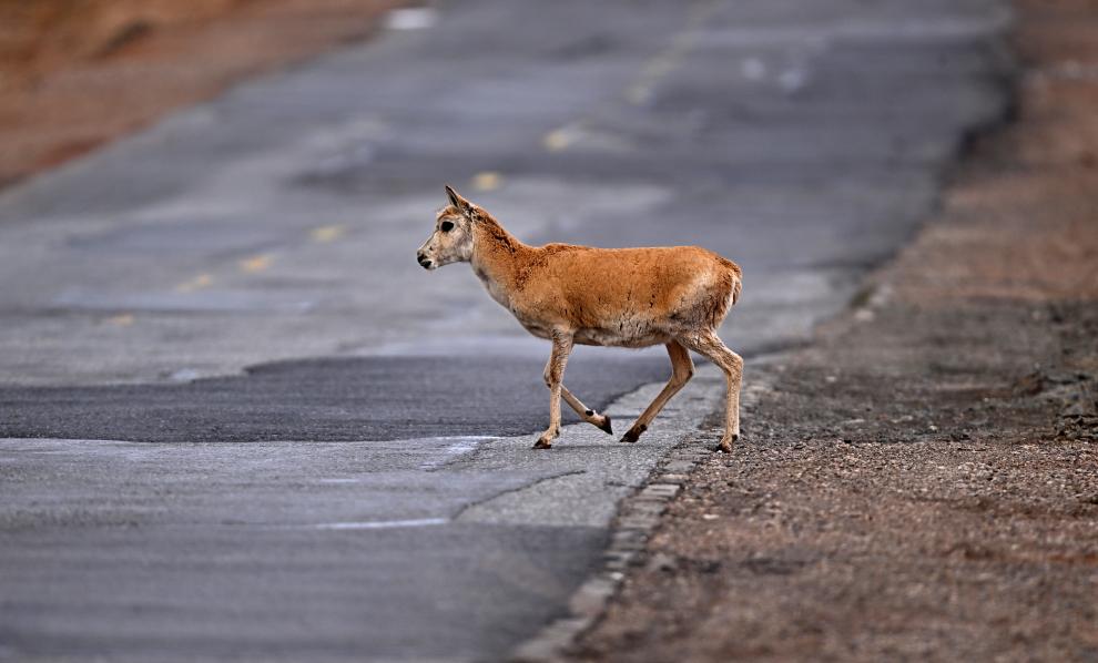 在可可西里,一只雌性待產藏羚羊通過青藏公路(2023年5月28日攝)。新華社記者 張宏祥 攝