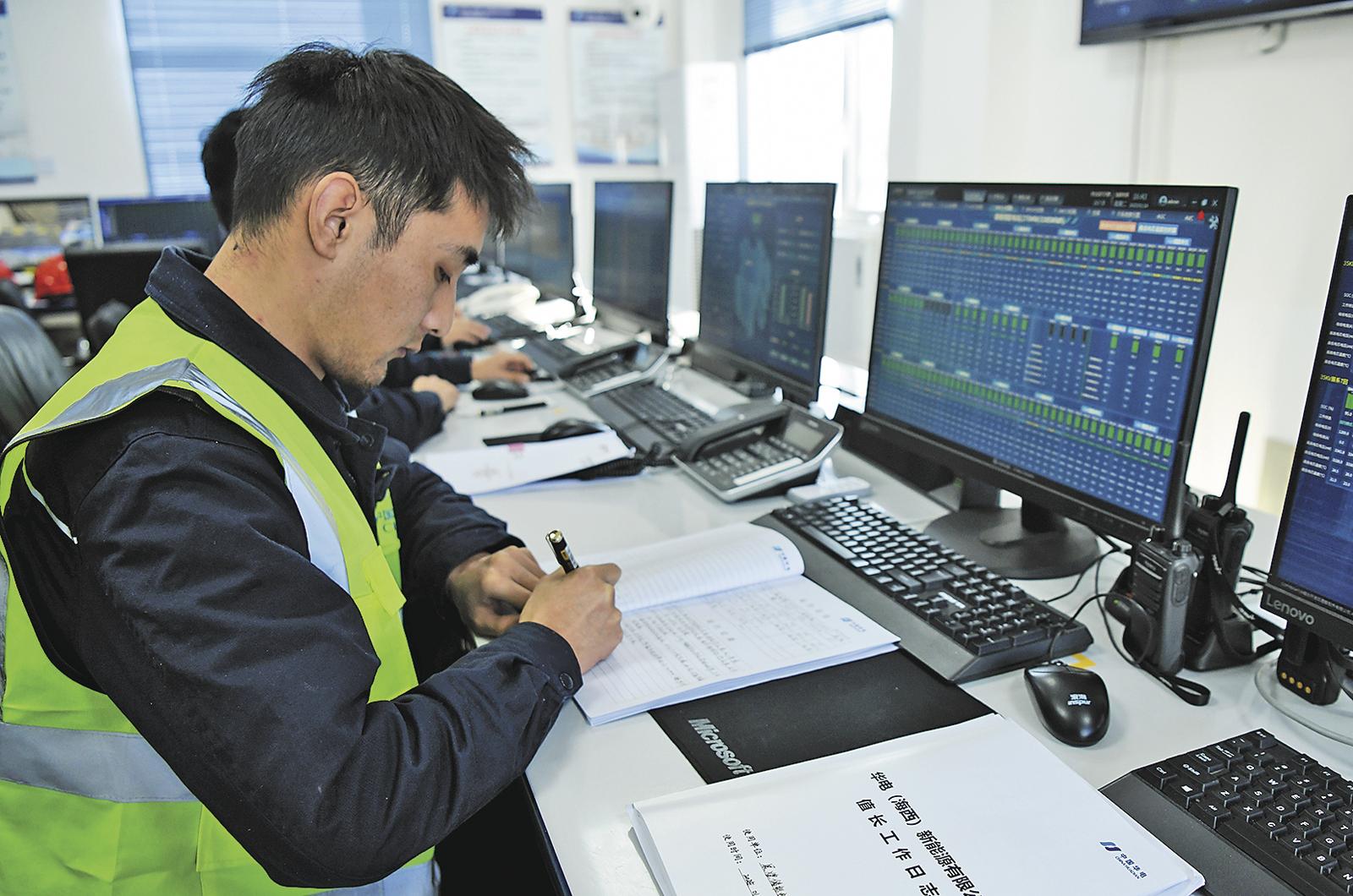 在中控室,記者看到大屏上實(shí)時(shí)顯示電能存儲百分比數(shù)據(jù),4名技術(shù)人員正通過數(shù)據(jù)監(jiān)控平臺,實(shí)時(shí)分析能量遙測數(shù)據(jù),翻查51個(gè)儲能單元的運(yùn)行數(shù)據(jù),查看有無告警信息。
