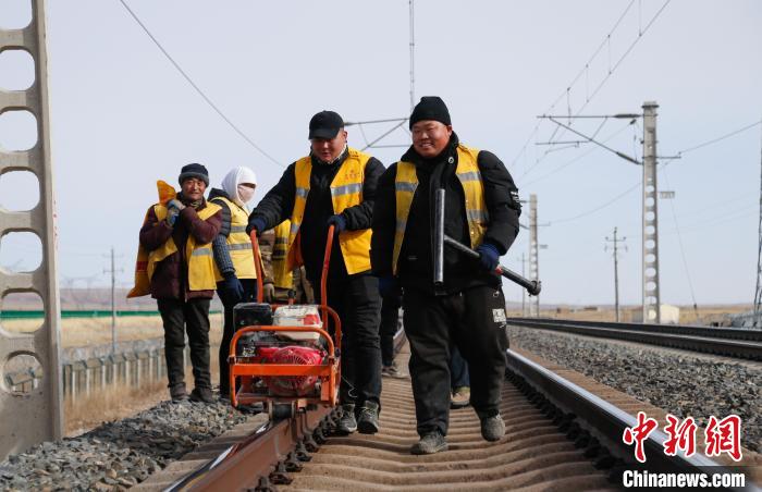1月22日,北方小年,中國鐵路青藏集團(tuán)有限公司德令哈工務(wù)段關(guān)角隧道工區(qū)“00后”職工郝斌(中),在天窗作業(yè)(為鐵路維修養(yǎng)護(hù),施工預(yù)留的時(shí)間段)過程中用力將壓機(jī)甩入鐵路鋼軌底部,整治線路凍害。郝斌所在的工區(qū)位于青海省海西蒙古族藏族自治州天峻縣境內(nèi)的新關(guān)角隧道,平均海拔3600米,是青藏鐵路的“咽喉要道”,也是世界高海拔鐵路第一長(zhǎng)隧。乙巳蛇年春節(jié),郝斌和他的11名同事將堅(jiān)守崗位,守護(hù)“天路”?!半m然無法和家人團(tuán)聚,但想到旅客能從我工作的線路上平安回家,我就感到自豪,工作也更有干勁?!焙卤笳f,這是他在工區(qū)度過的第二個(gè)春節(jié)。中新社記者 馬銘言 攝
