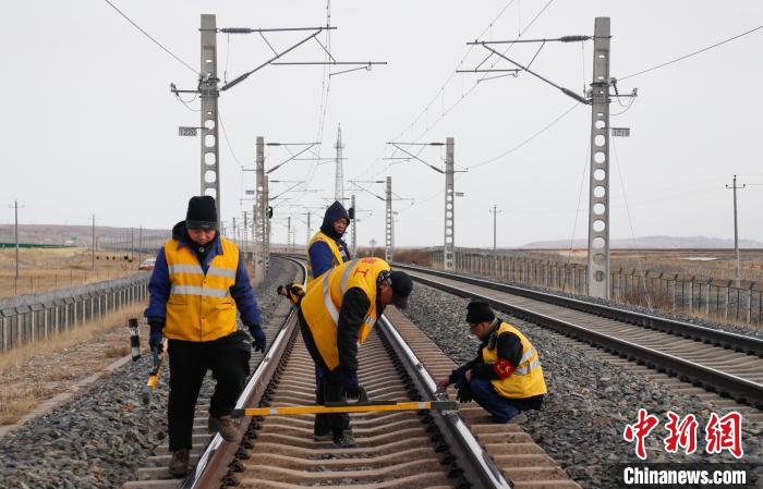 1月22日,北方小年,中國鐵路青藏集團(tuán)有限公司德令哈工務(wù)段關(guān)角隧道工區(qū)“00后”職工郝斌(中),在天窗作業(yè)(為鐵路維修養(yǎng)護(hù),施工預(yù)留的時(shí)間段)過程中使用電子道尺測(cè)量鋼軌幾何尺寸。中新社記者 馬銘言 攝
