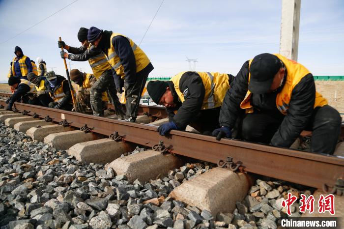 1月22日,北方小年,中國鐵路青藏集團(tuán)有限公司德令哈工務(wù)段關(guān)角隧道工區(qū)“00后”職工郝斌(右一)、趙鵬舉(右二),在天窗作業(yè)(為鐵路維修養(yǎng)護(hù),施工預(yù)留的時(shí)間段)過程中將厚度不一的墊板安裝到鋼軌底部,整治線路凍害。中新社記者 馬銘言 攝