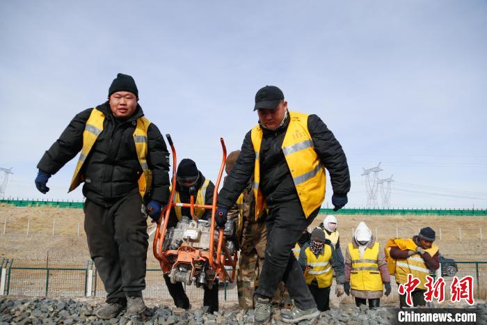 1月22日,北方小年,中國鐵路青藏集團(tuán)有限公司德令哈工務(wù)段關(guān)角隧道工區(qū)“00后”職工郝斌(右)、趙鵬舉(左),在天窗作業(yè)(為鐵路維修養(yǎng)護(hù),施工預(yù)留的時(shí)間段)過程中合力將螺絲機(jī)抬上線路。中新社記者 馬銘言 攝