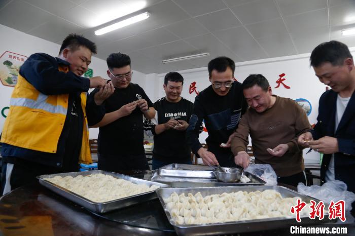 1月22日,中國北方小年,青藏集團(tuán)公司德令哈工務(wù)段關(guān)角隧道工區(qū)“00后”職工郝斌(左二)、趙鵬舉(左一)和工友們包餃子。中新社記者 馬銘言 攝