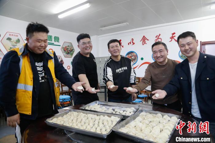 1月22日,中國北方小年,青藏集團(tuán)公司德令哈工務(wù)段關(guān)角隧道工區(qū)“00后”職工郝斌(左二)、趙鵬舉(左一)和工友們展示包好的餃子。中新社記者 馬銘言 攝