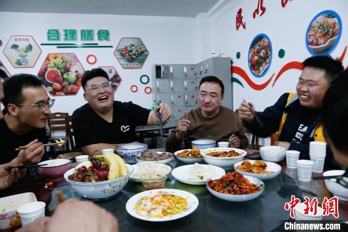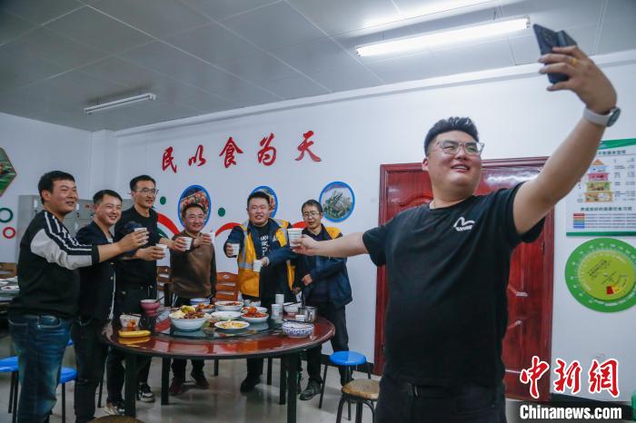 中國北方小年,青藏集團(tuán)公司德令哈工務(wù)段關(guān)角隧道工區(qū)“00后”職工郝斌(左二)、趙鵬舉(右一)和工友們開心度過小年夜。中新社記者 馬銘言 攝