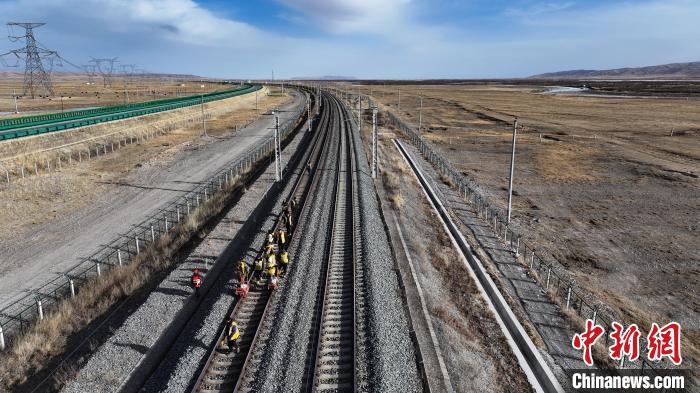 1月22日,北方小年,中國鐵路青藏集團(tuán)有限公司德令哈工務(wù)段關(guān)角隧道工區(qū)職工在天窗作業(yè)(為鐵路維修養(yǎng)護(hù),施工預(yù)留的時(shí)間段)過程中整治線路凍害。(無人機(jī)照片)中新社記者 馬銘言 攝