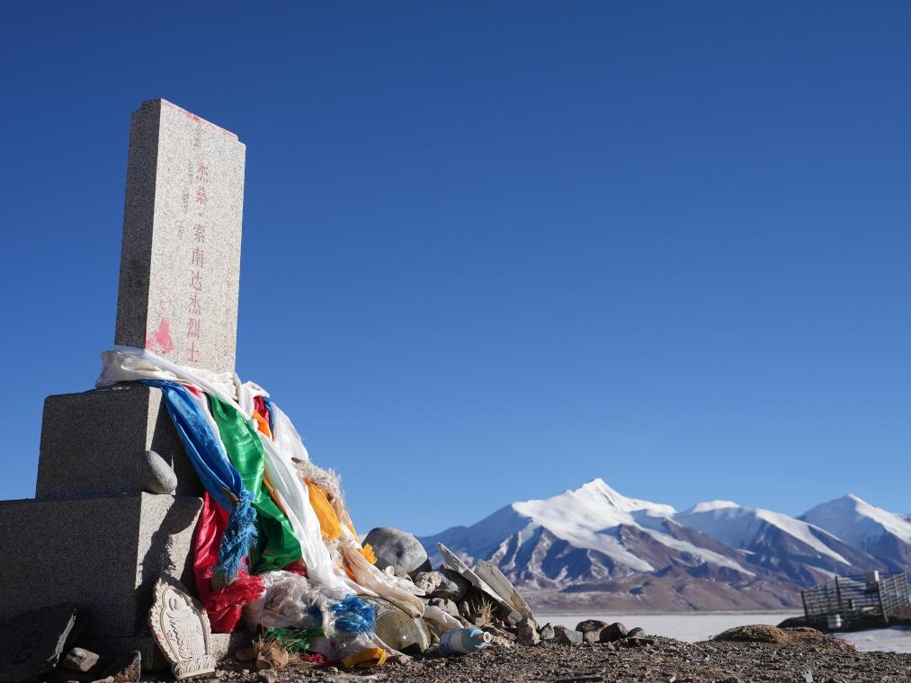 這是可可西里無(wú)人區(qū)腹地太陽(yáng)湖湖邊索南達(dá)杰烈士紀(jì)念碑,索南達(dá)杰犧牲在太陽(yáng)湖,他的骨灰也撒在太陽(yáng)湖(攝于2025年1月14日)新華社發(fā)