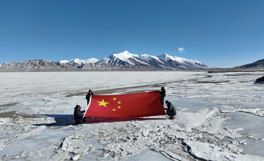 巡山隊(duì)員在可可西里無(wú)人區(qū)腹地的太陽(yáng)湖湖邊,展開(kāi)一面五星紅旗,這面國(guó)旗曾于2021年10月2日在天安門廣場(chǎng)升起。(攝于2025年1月14日)新華社發(fā)