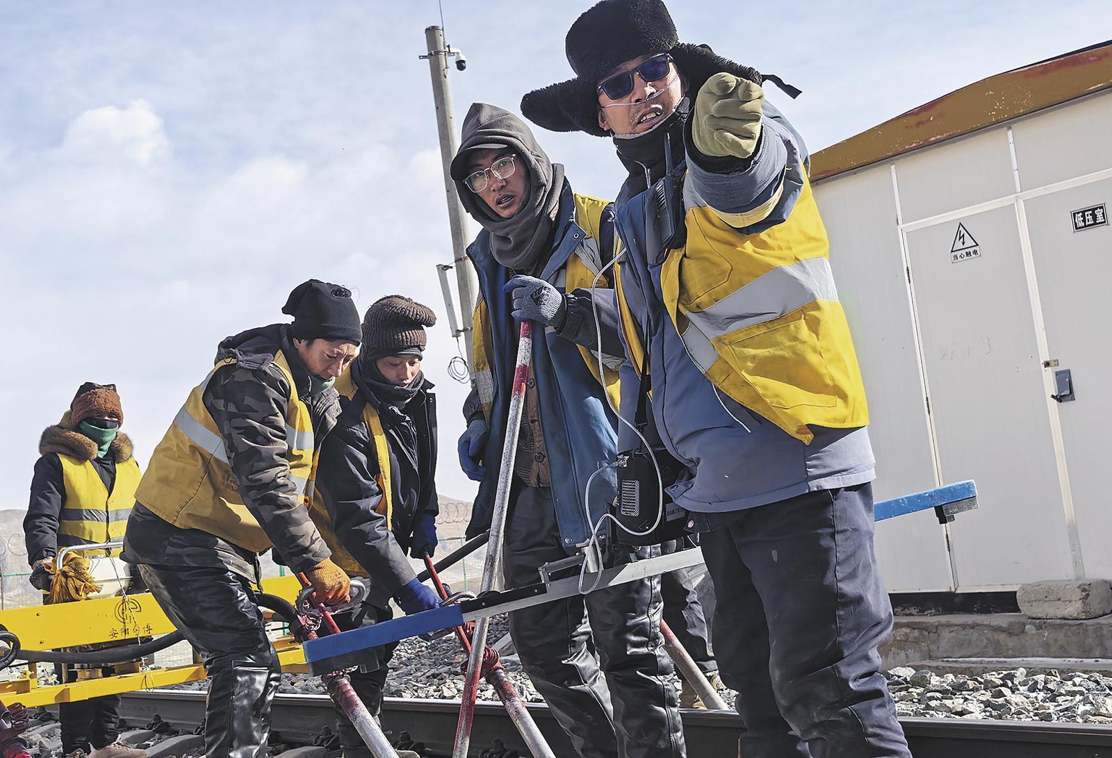 余亮亮(右一)與工友們相互配合檢查鐵軌。