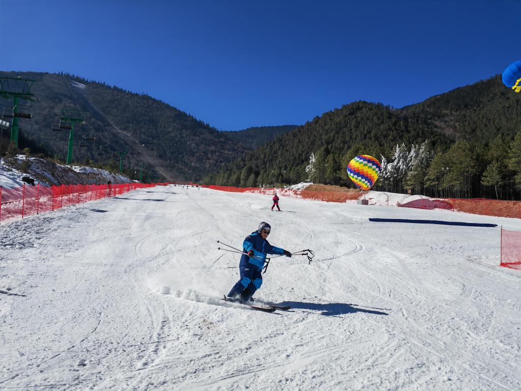 2024年12月28日,游客在云南省迪慶州香格里拉市的七星雪滑雪場(chǎng)滑雪。新華社記者浦超 攝