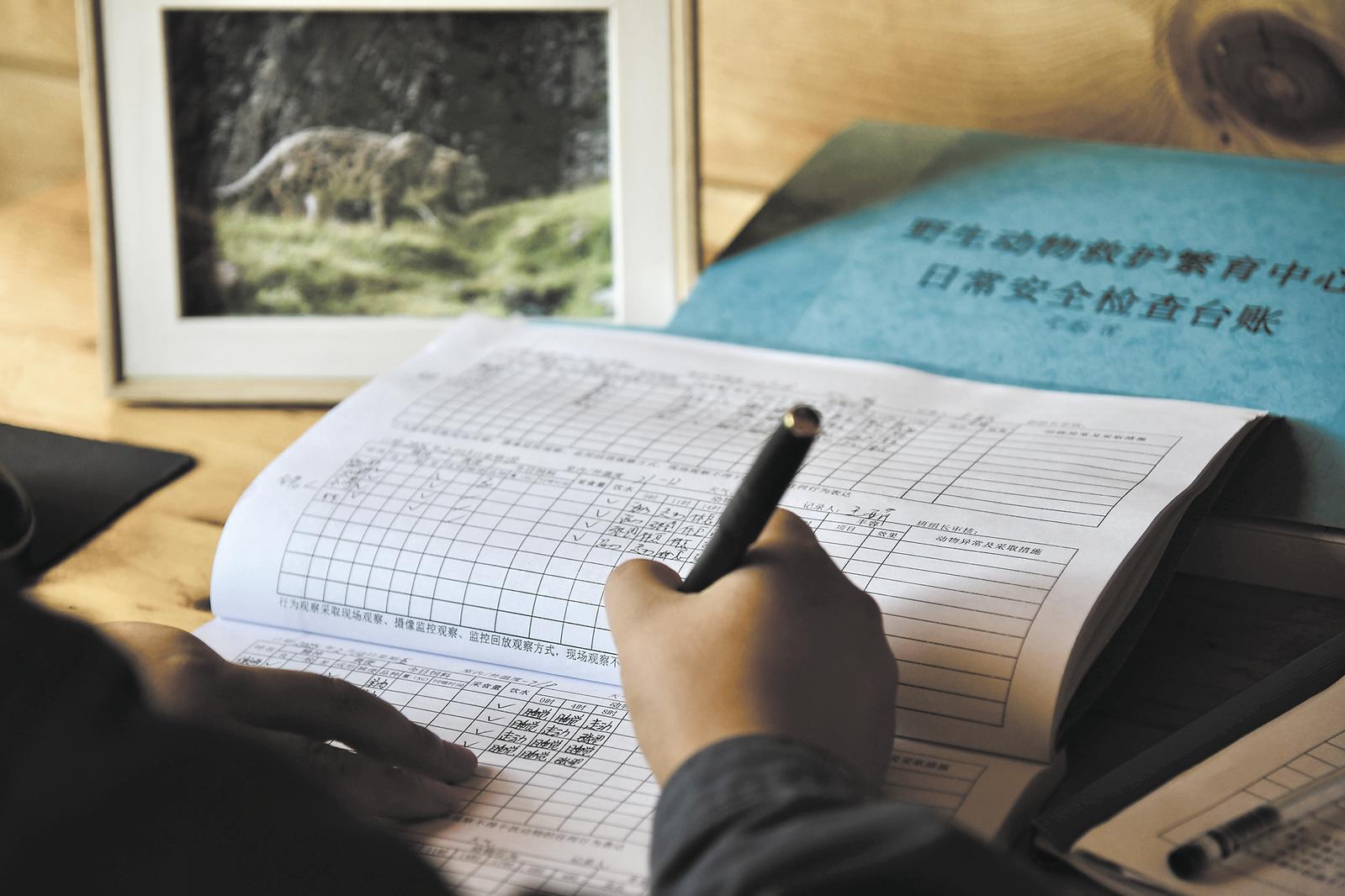 監(jiān)控室內(nèi),觀察完雪豹活動(dòng)后的王亞萍正在詳細(xì)地記錄著傲雪上午的活動(dòng)細(xì)節(jié),這些珍貴的數(shù)據(jù)對(duì)于雪豹的保護(hù)與研究至關(guān)重要?!巴ㄟ^記錄,我也很熟悉園內(nèi)每一只雪豹的性格與喜好,從雪豹的一舉一動(dòng)中,掌握與它們交流的方式?!蓖鮼喥家贿呌涗浺贿咈湴恋卣f。