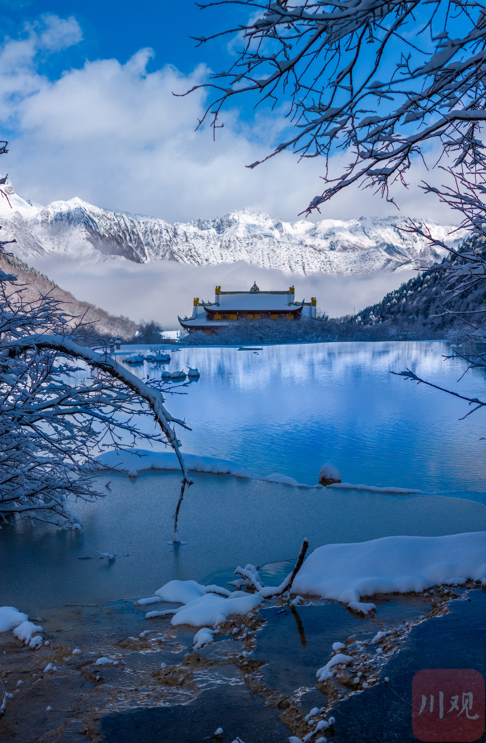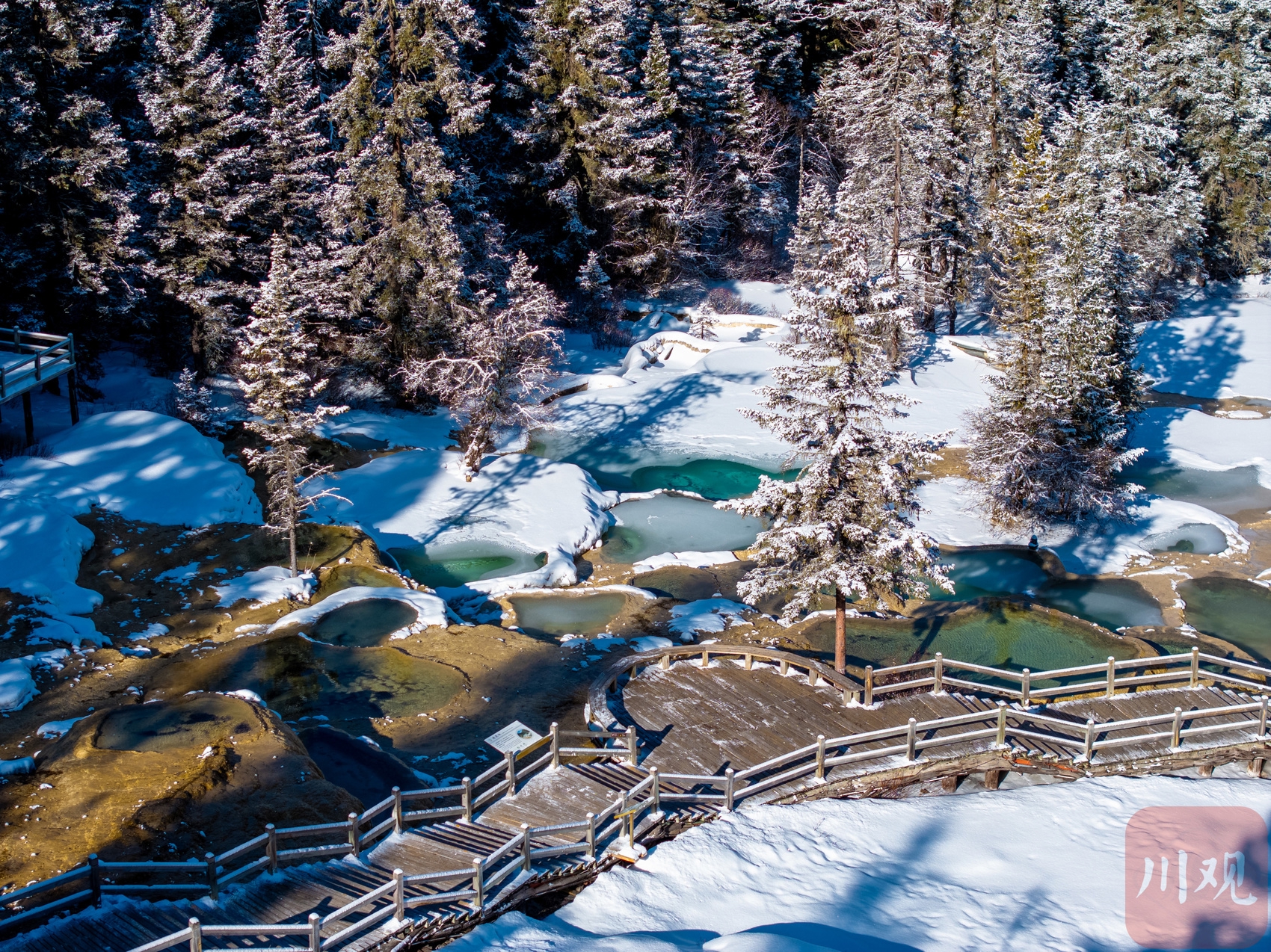 2月20日,大雪覆蓋了黃龍景區(qū)全部范圍,彩池在白雪映襯下更顯青綠,還有四周棧道、原始森林、鈣華、瀑布、古寺,積雪后呈現(xiàn)另一番動人景象。晶瑩剔透的冰花,與四周涌動的春天氣息形成特別的畫卷,藍(lán)綠、明黃、淺白等顏色相互交織,仿佛是大自然的調(diào)色盤。