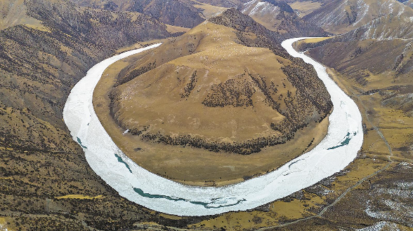 3月27日,位于玉樹藏族自治州治多縣的長江第一灣,春意漸濃。隨著氣溫回暖,冰封河面逐漸消融。從高空俯瞰,長江蜿蜒如巨龍,雖仍覆冰雪,但零星裂縫中翠綠的河水閃爍,宛如鑲嵌了綠松石的腰帶纏繞周圍的山體。