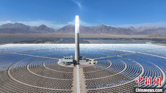 電站建在蒼茫戈壁深處,以同心圓陣列排開(kāi)的27135面“超級(jí)鏡子”圍繞著中央200余米高的吸熱塔,自動(dòng)跟蹤收集太陽(yáng)光能,精準(zhǔn)反射、投遞至塔頂吸熱器,配置的7小時(shí)熔鹽儲(chǔ)能系統(tǒng)通過(guò)加熱熔鹽儲(chǔ)存熱能,再根據(jù)電網(wǎng)調(diào)度指令夜間釋放熱能,最終帶動(dòng)汽輪機(jī)發(fā)電。