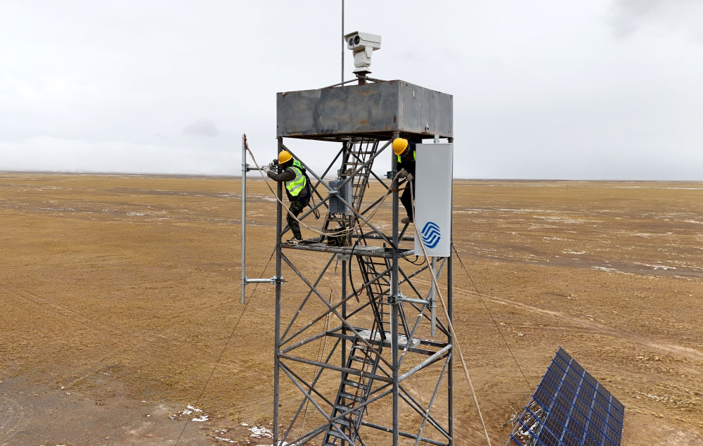 4月25日,中國(guó)移動(dòng)通信集團(tuán)青海有限公司工作人員在可可西里庫(kù)賽湖附近安裝5G基站設(shè)備。(受訪(fǎng)單位供圖)