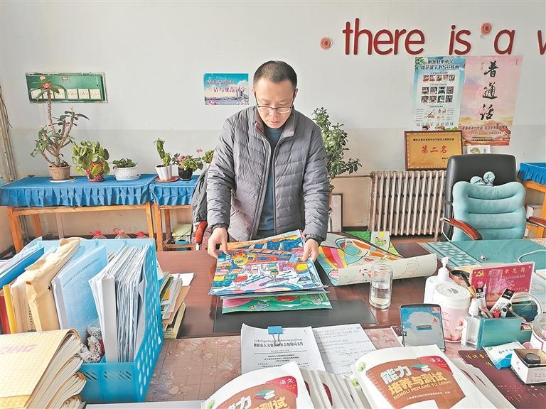 陳磊查看學(xué)生的繪畫作品。通訊員 王曉炯 攝