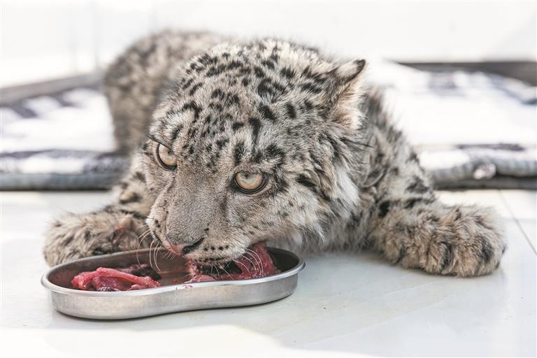 這只每天對(duì)著鏡頭認(rèn)真吃飯、翻身打滾的小雪豹從外形上看,已與同齡的正常雪豹幼崽無(wú)明顯差別,很難讓人想起3月4日在玉樹藏族自治州治多縣被發(fā)現(xiàn)時(shí)那個(gè)瘦成“一張皮”的雪豹幼崽的樣子。